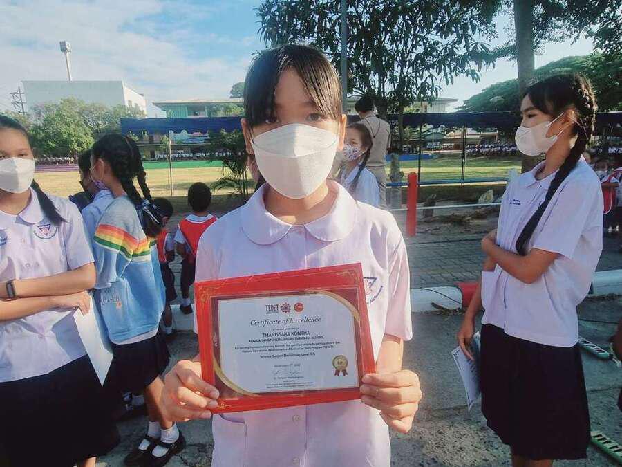 มอบเกียรติบัตร และร่วมแสดงความยินดีกับ เด็กหญิงฐานิสสรา โกณฑา นักเรียนระดับ ชั้นประถมศึกษาปีที่ 51 ที่มีคะแนนการสอบแข่งขันโครงการประเมินและพัฒนาสู่ความเป็นเลิศ ทางคณิตศาสตร์และวิทยาศาสตร์(TEDET)